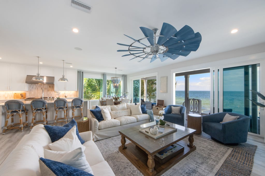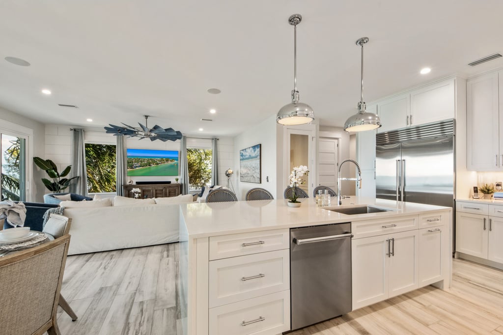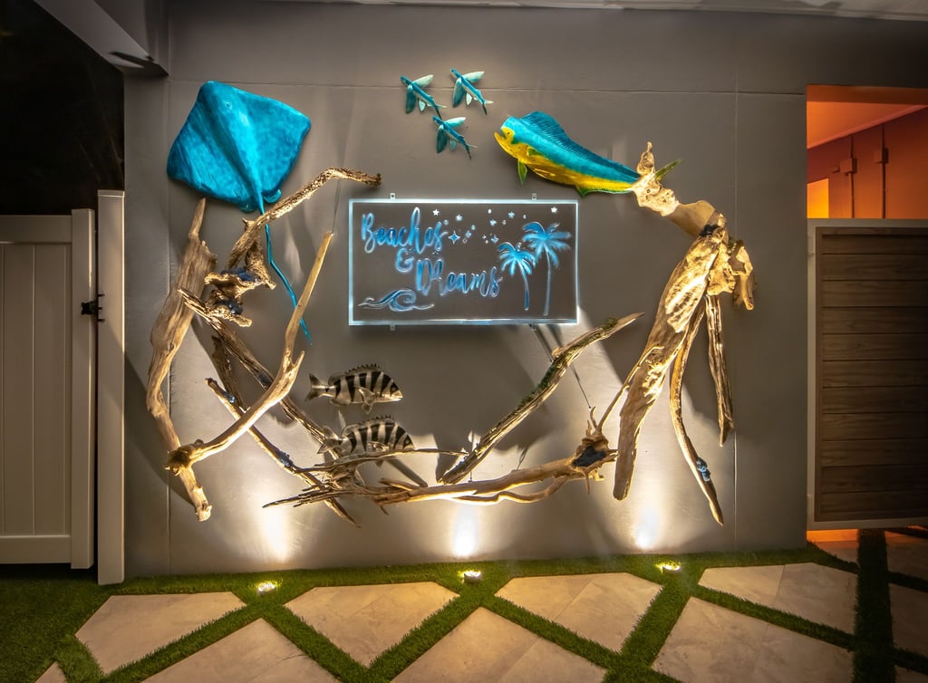 Beaches & Dreams is new as of late 2020, and all 3,000 square feet plus has been professionally designed as a collaboration with a local designer and a former Disney Engineer. The home embraces a coastal elegant theme adorned with shiplap and local art throughout.