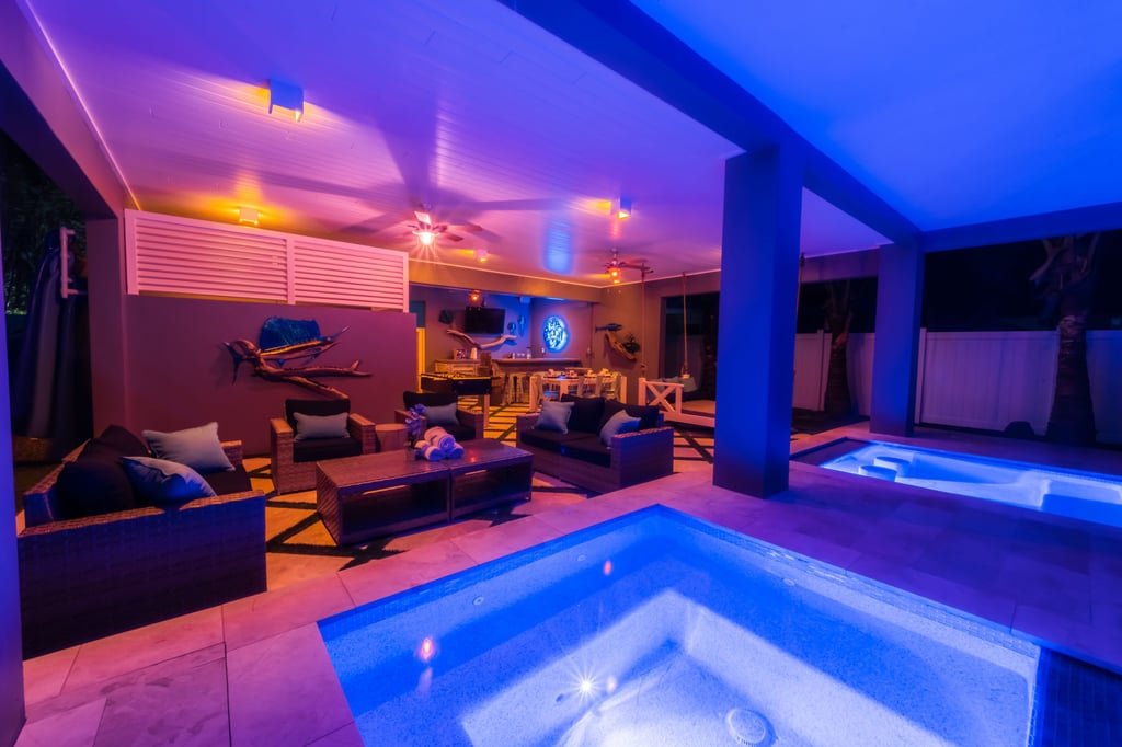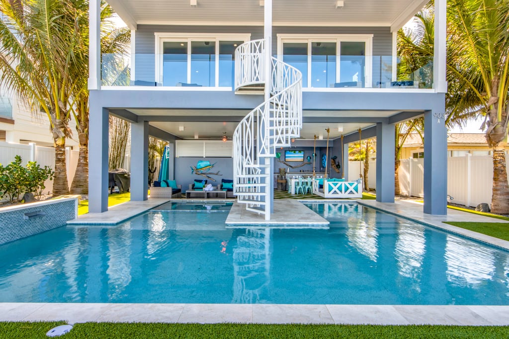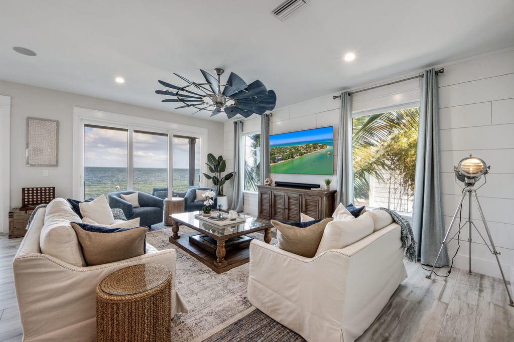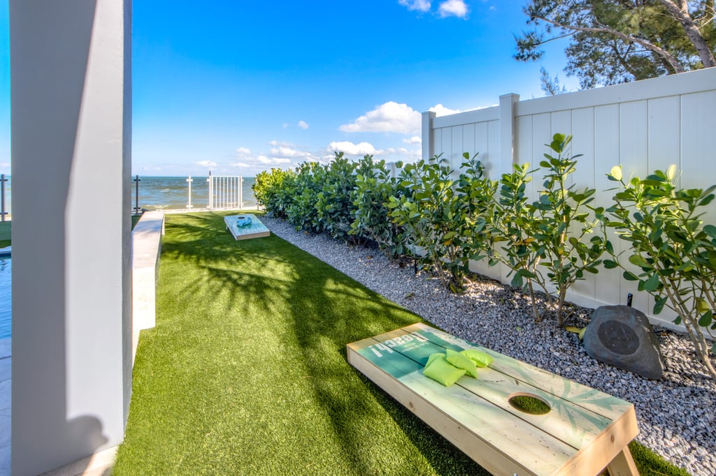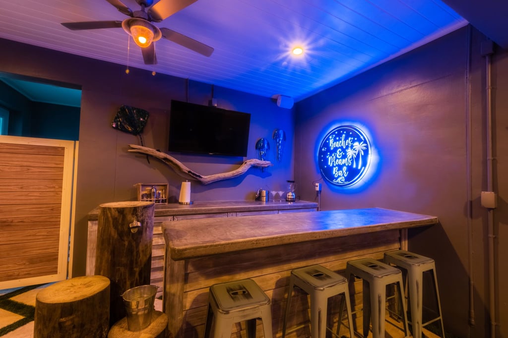The patio features a commercial grade bar with 3.5 inch concrete countertops, nautical pilings, under the cabinet ice machine and refrigerator. A nautical designed swinging bed has room for a few and is perfectly placed to relax, take a nap and enjoy the bay breeze. Patio entertainment is complete with a 6-speaker Sonos outdoor system, Sunbrite outdoor rated TV and foosball table.