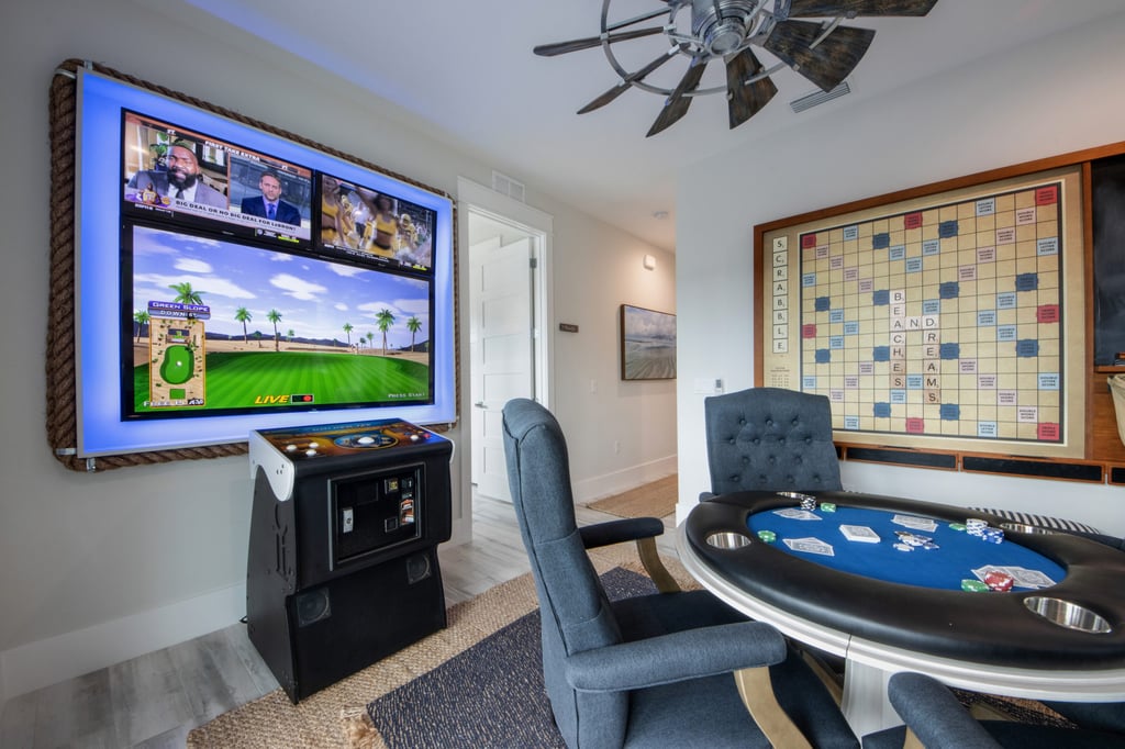 The Shark’s Den game room will keep the family entertained for hours with 3 TV’s for game day, a Golden Tee golf simulator, poker table and 7-foot wall mounted scrabble table.