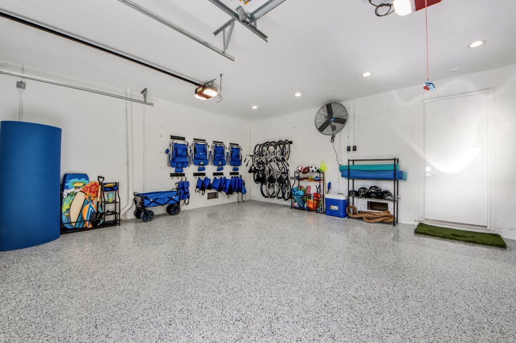 The 2 car garage isn’t just there for your vehicles but also includes all the toys, games and accessories to make your vacation complete: 6 bikes, beach wagon, life vests, cornhole set, golf clubs, floats, cooler, body boards, frisbees, sports balls, beach umbrella, sand mat and numerous toys and shovels for fun in the sand!